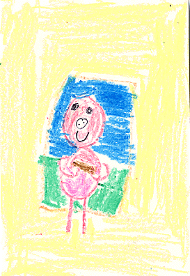 The book is funny because pigs don't eat pancakes, take baths, put on clothes or do all the things she does in this story. I also like the happy illustrations because the funny pig makes me feel good. I like it when the girl keeps giving the pig stuff because it's funny.
